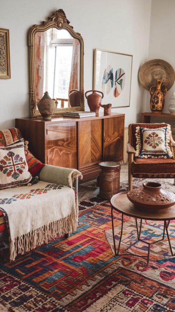 🖼 Picture This: A thrifted wooden sideboard, an antique brass mirror leaning against the wall, and a patterned Eastern rug that tells a story of travel and adventure.