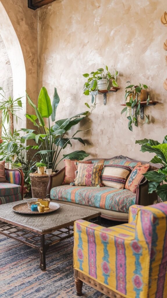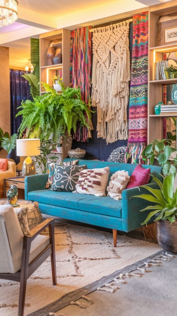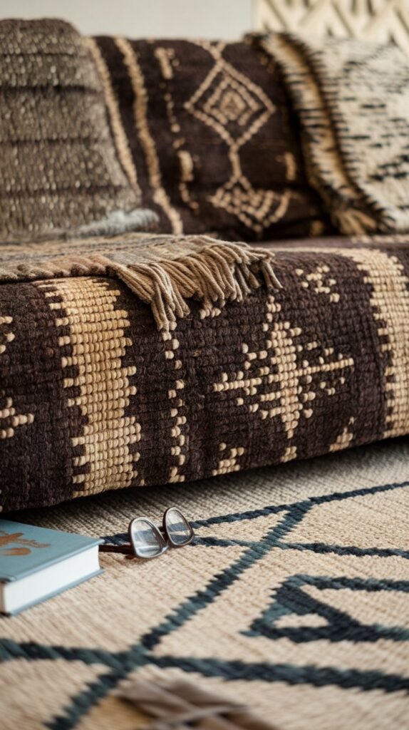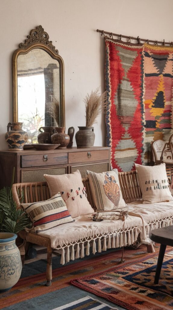 - Layer bold patterns and textures, like embroidered pillows, fringed throws, and global-inspired accents.