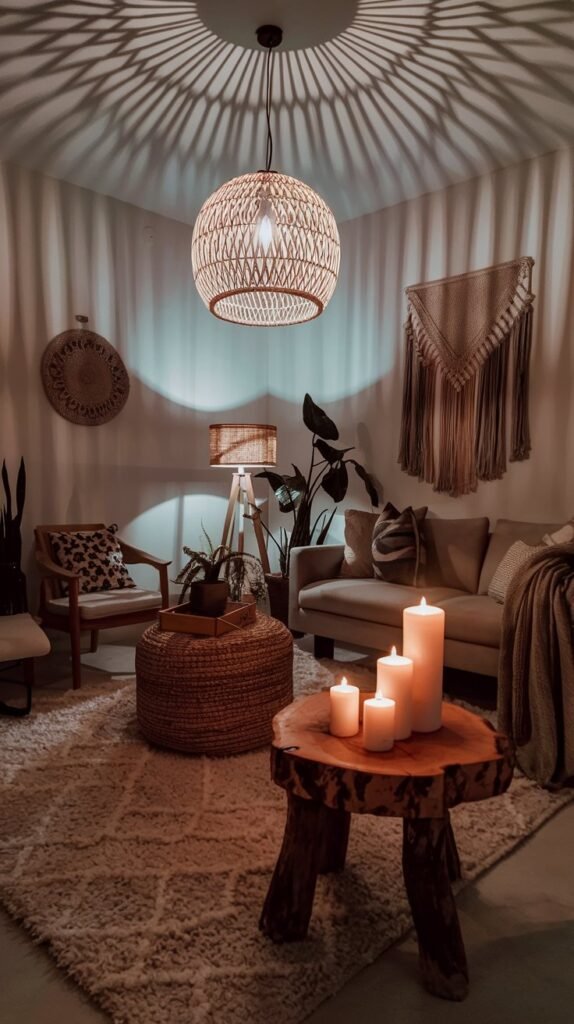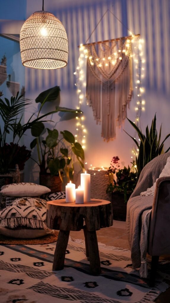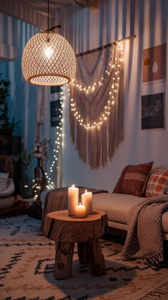 🖼 Picture This: A softly lit room with a woven pendant light, flickering candles on a wooden side table, and fairy lights draped over a macramé wall hanging.