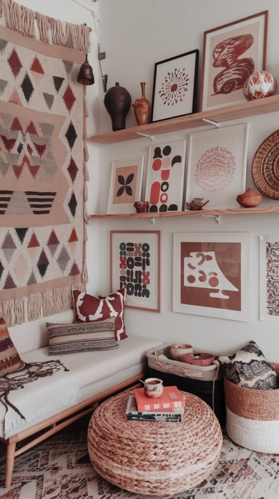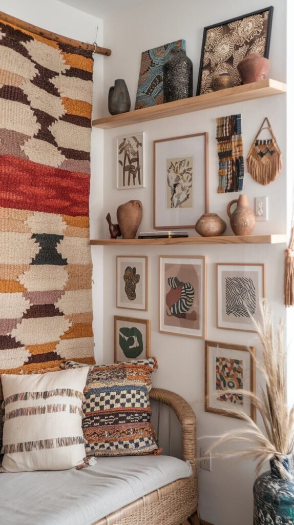 🖼 Picture This: A statement wall with an oversized woven tapestry, a mismatched gallery wall of collected prints, and hand-sculpted pottery on floating shelves.