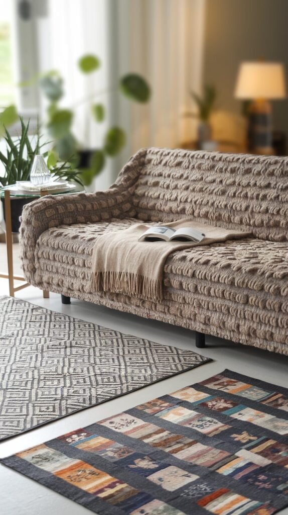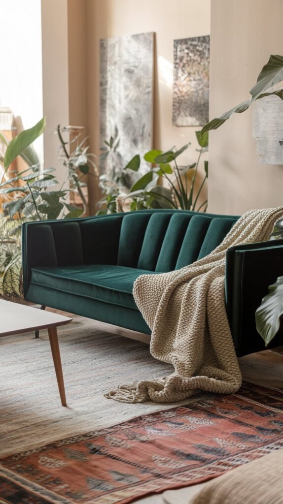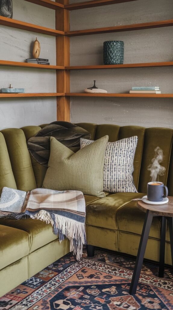 🖼 Picture This: A cozy nook with a deep green velvet sofa, layered rugs underfoot, and an oversized knit throw—perfect for slow mornings with a cup of coffee.