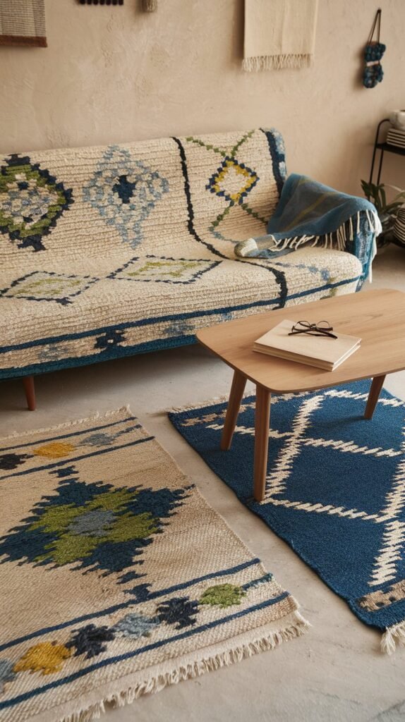 - Layer woven jute rugs, plush Moroccan-style carpets, and textured pillows for depth.