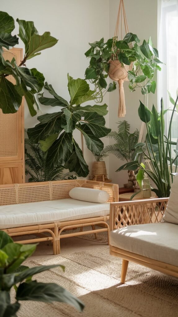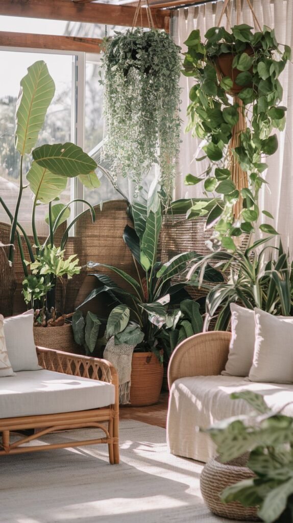 🖼 Picture This: A bright space filled with lush greenery, rustic wooden accents, and woven textures—bringing the beauty of nature inside.