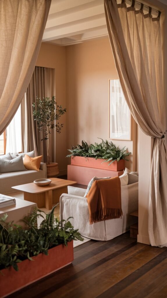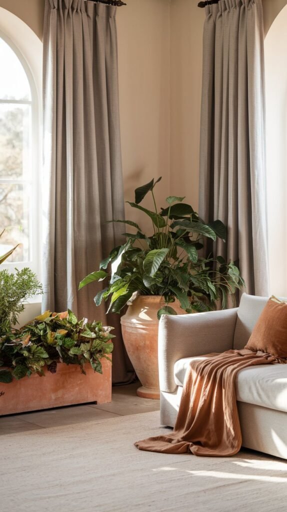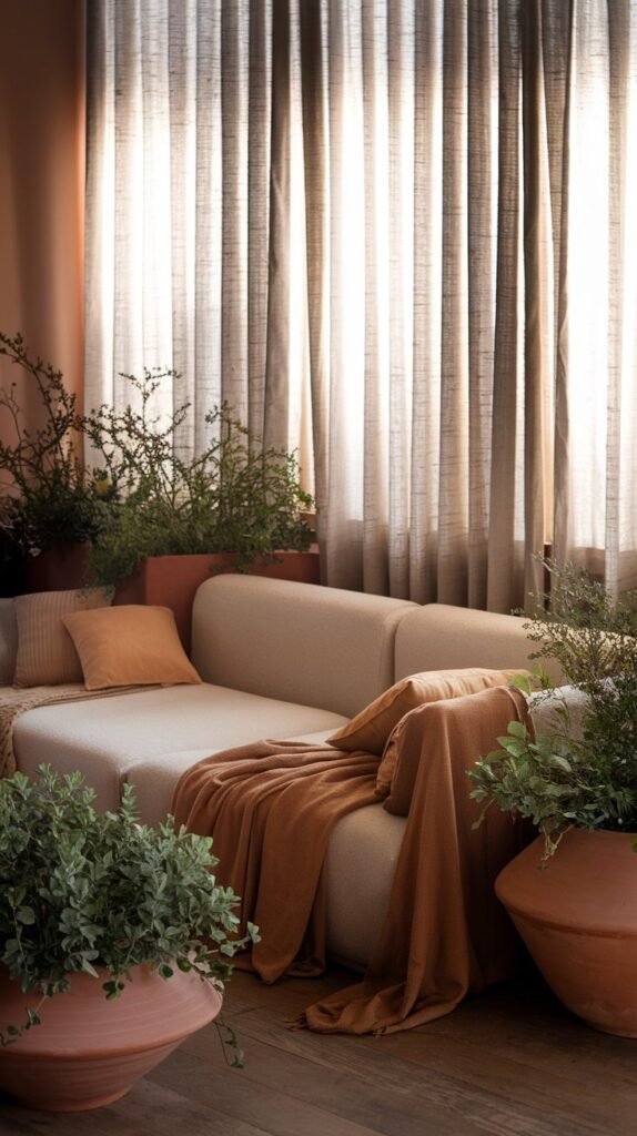 🖼 Picture This: A warm-toned living room with soft linen drapes, an ochre throw on a light sofa, and terracotta planters filled with greenery.