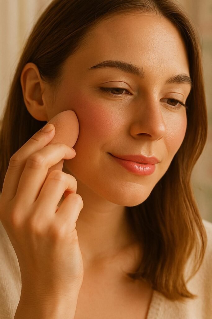 I warm the product up on the back of my hand and tap it in slowly. Cream or liquid blushes are best—they melt into the skin and look like you’re naturally glowing. I always smile while applying; it keeps the placement high and flattering.